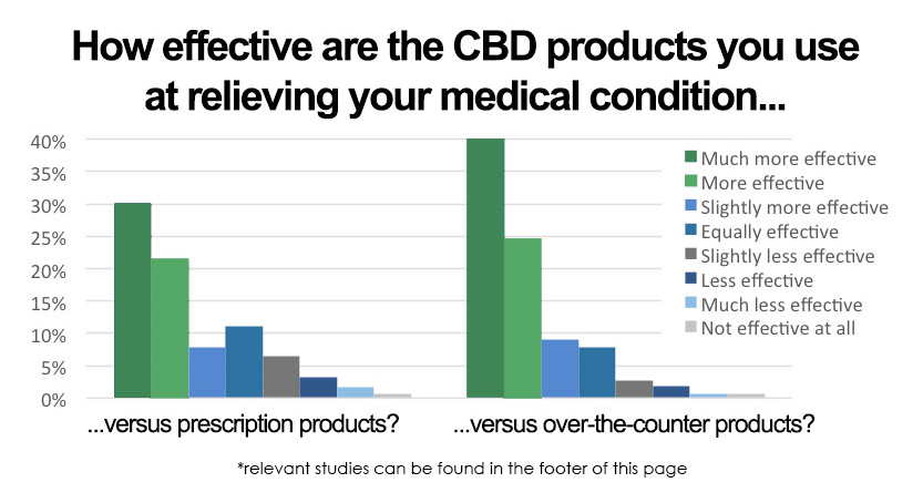In fact, a recent study revealed that 60% of users say CBD is “significantly more effective” than prescription medications. 75% found CBD more effective than over-the-counter products, as you can see below: